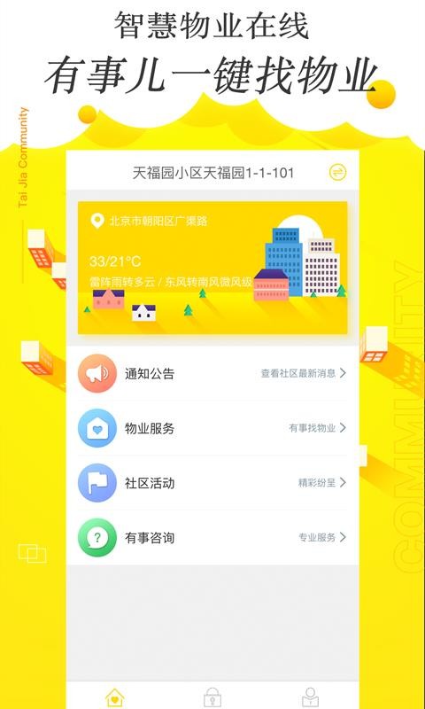 泰家社区是一款服务于社区生活的软件,用户在平台里能够快速的了解各种生活信息,平台会实时的展示社区的各种情况,让社区里的用户可以快速的进行查看,了解到各种生活信息,确保你在社区里能够更好的进行生活,得到优质的生活服务,快速的进行使用;平台里的管理功能非常的多,通过平台可以实时的管理用户的物业信息,各种物业情况全部展示在平台里,你可以更好的进行使用,实时的解决你的需求,让用户能够清楚的进行查看,在线就可以更好的解决物业问题;还具有各种安全的门禁系统,智能的进行管理,实时的保护居民的安全,得到优质的服务。