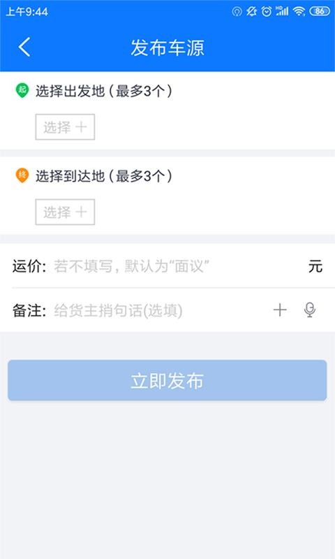 3、点击发布车源,选择三个出发地和到达地,输入运价后快速发布