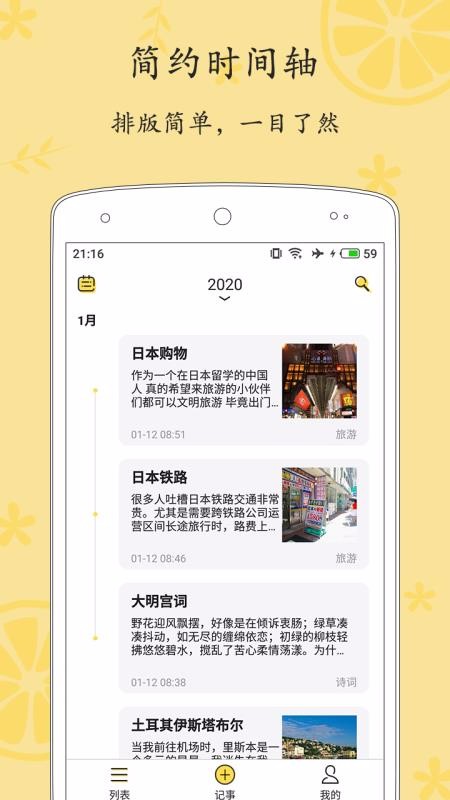 1、拥有简约时间轴,排版简单,清晰明了,让用户一目了然发现自己的笔记内容;