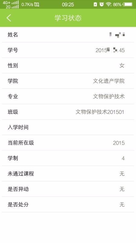 6、进入学习状态页面,查看姓名、学院、专业、入学时间、是否处分等