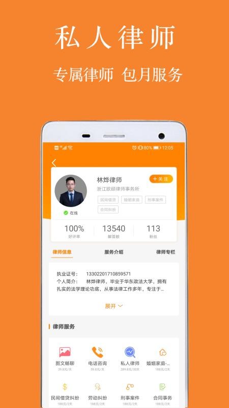 4、提供私人律师功能,用户可以让律师担任自己的私人律师,为自己提供一对一服务;