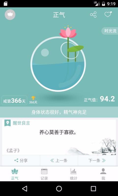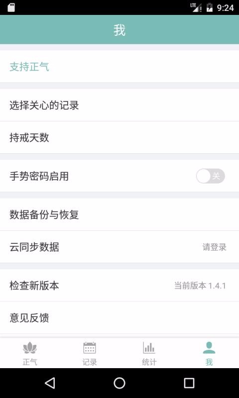正气是一个帮助用户记录习惯,戒掉不良行为的软件,在该平台中通过日历记录每天自制的行为,选择时间即可查看持戒明细;随时在首页显示用户一共持戒的天数,并计算出当前的正气值,并实时表示用户当前身体状况是否良好,精气神是否充足等;推送各种醒世良言,用户任意的选择上一条或下一条进行查看,还可以将喜欢的句子分享到其他平台;提供了周频率、月视图和年视图,勾选要查看的记录,即可在图表中发现该记录近十周的变化;用户还可以选择关心的记录,随时为用户提醒需要戒掉该行为,还会推送相关记录的信息。