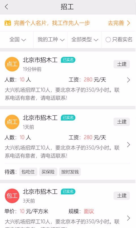 6、通过地点、工种、类型、实名等即可筛选招工信息,并查看单价、工资、待遇等;