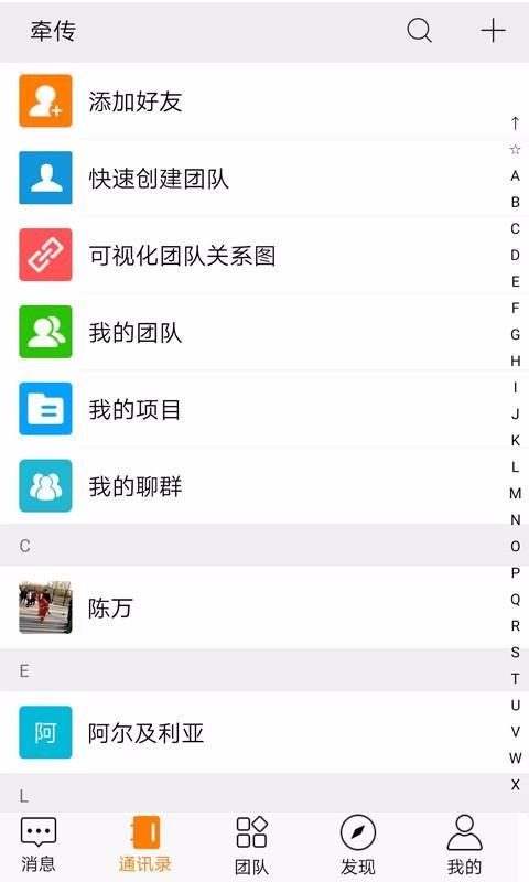4、点击通讯录,选择添加好友、我的团队、我的项目、我的群聊等