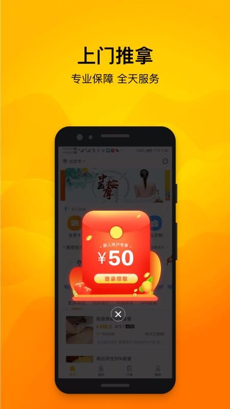 往约是一个享受生活快捷服务的软件,在这里能预约上门推拿服务项目,为用户推荐优质的推拿服务项目,还会推荐类似推拿按摩的会员卡产品;如果用户是第一次登录使用这款软件的话能看到跳出来的新人红包,点击登录领取后就会进入到登录页面,只要登录后就能领取该红包;这里的推拿服务会根据地理位置的不同为你推荐附近的优先资源,所以需要核对当前定位的城市是否正确,只有在确认正确后才能使用平台上面的预约上门服务,如果地址不正确预约服务后会因为位置太远无法为用户提供相应的上门推拿服务,需要在选择的时候先确认地址。
