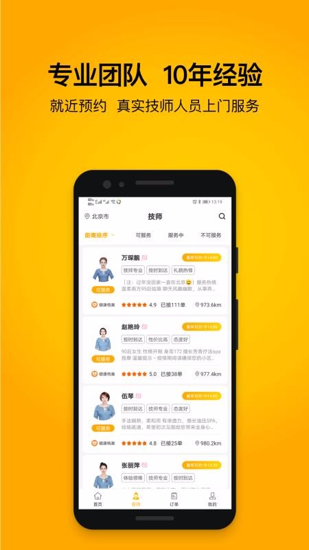6、技师中心设置了许多划分栏目,其中包括距离排序栏、可服务栏、服务中与不可服务;