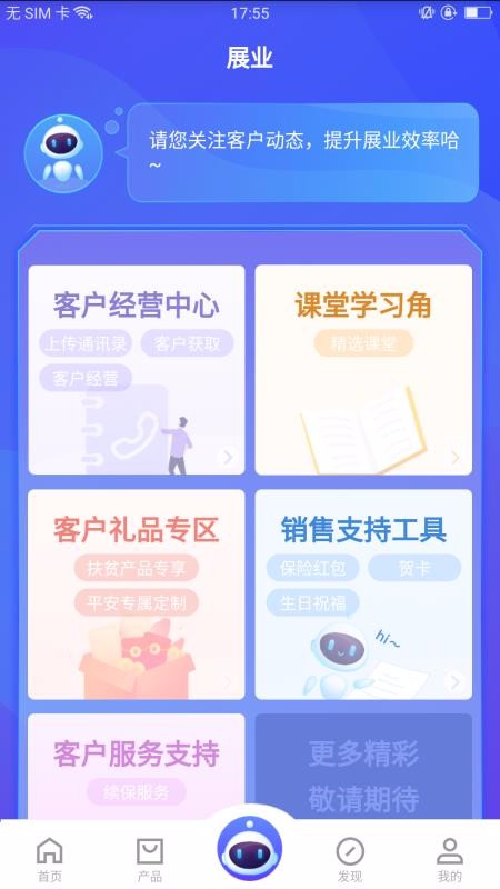 5、进入展业页面,点击客户经营中心、课堂学习角、客户礼品专区等