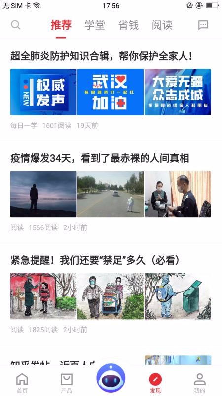 6、点击发现,选择推荐、学堂、省钱或阅读