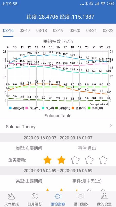 钓鱼天气是为钓鱼爱好者提供的天气服务软件,帮助用户寻找合适的天气和地点进行钓鱼;打开该软件的定位服务,即可为你通过经纬度提供天气数据,选择时间即可查看当天的降雨概率、温度、大气压、可见度、露点、总云量等数据,并且还提供了图表展示数据的变化;为你提供了日月运行的信息,在线即可查看日出、日落、日中天、民用曙光、航海曙光等具体时间,还可以查看日月黄经差值、月亮照明比例、地月距离等;在垂钓指数中,通过图表为你展示了随适合垂钓的时间,并提供影响该时间的事件。