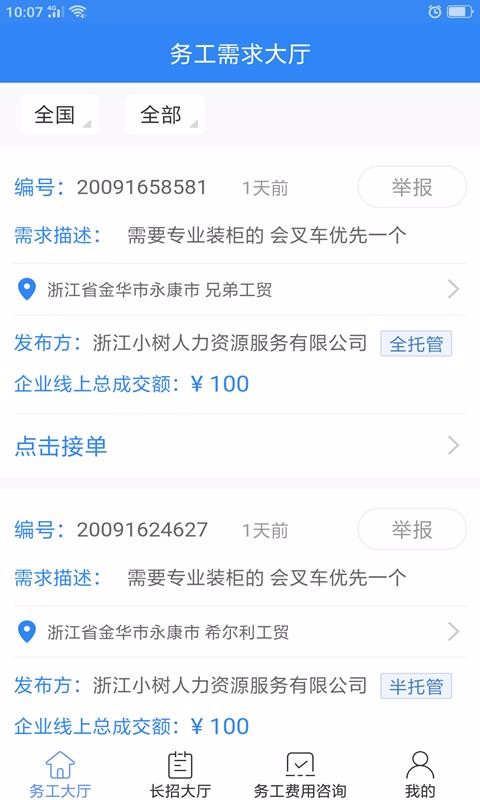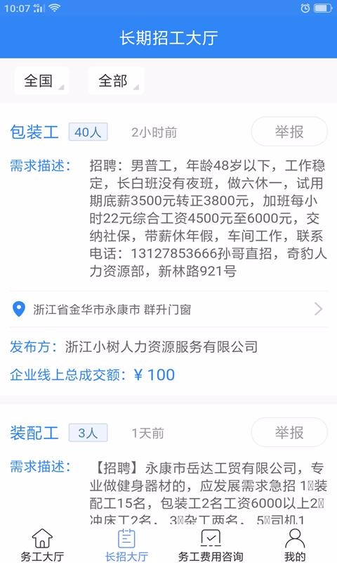 连众app为企业解决许多的用工需求,为务工人员们提供了一个丰富的工作资源平台;务工大厅中汇总并展示了丰富的短工需求资源,工人们可以在该页面上筛选出不同地区的用工需求资源,找到这些资源后就能查看详细的地理位置并通过上面的联系方式应聘工作;用户可以在务工需求大厅中看到每一个工作发布方的详细信息,如果自己发现这些信息存在虚假的情况还能立即举报,设计该功能的目的就是为大众能创造更好的招聘求职环境;在务工大厅的旁边设置了长工大厅,上面主要展示各种长期招工的资源信息,想要比较稳定工作的用户能在这里选择职位资源。