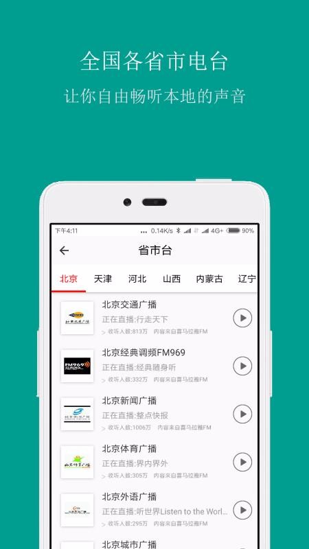 3、省市台,连接更省市的广播电台信息,收听省市的新闻信息;