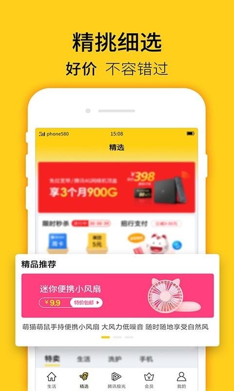 3、点击精选,查看各种精选的商品,快速的购买各种生活用品和工具