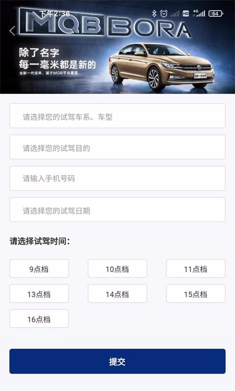 5、试驾预约,填写试驾车的信息即可选择预约试驾时间,满足各种试驾的需求;