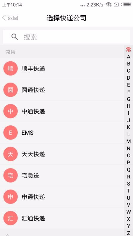 2、根据快递公司的名称或首字母即可查询相应的公司并进行选择;