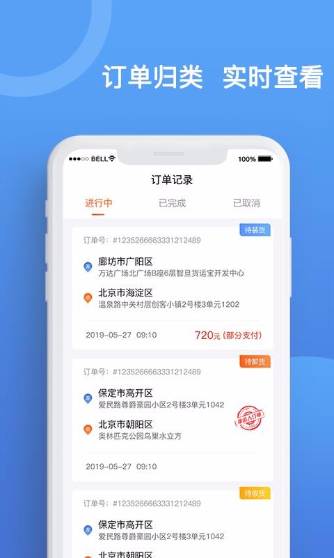 2、订单归类查看非常方便,所有的订单都按照进行中、完成和已取消订单划分;