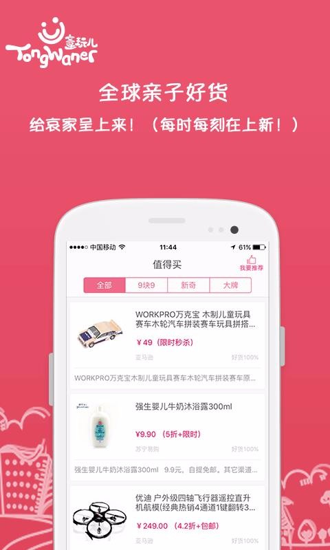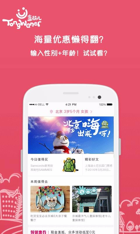 童玩儿app是一款集亲子出游地点查询与儿童商品购买于一体的多功能软件;这里向用户提供众多的商品,用户可以直接根据自己的需要选择购买儿童玩具、儿童生活用品等;可以直接查看平台推荐的众多值得去的游玩场地,随时的查看选择进行游玩等,能够让你与孩子的周末有更多的事情可做,可以有效的促进你与孩子之间的距离等;提供的优惠好物购买更加的实惠,能够让用户购买到性价比非常高的商品,非常值得使用的平台;家长关注更多的育儿指南,让你的育儿更加的轻松,能够掌握更专业的育儿知识与小窍门等。