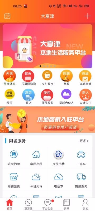 大夏津app是一款同城服务办理的多功能手机软件;招聘求职更加的方便,跑腿代购更加的快捷,还能直接选择查询相应的酒店,让自己的出行住宿更加的方便,是一款非常实用多样化的平台;这里的内容非常的丰富,用户查询选择众多,可以让自己的生活更加的便利,申请入驻至平台能够让自己赚取到更多的收益;美食外卖购买可以快速的收到,让自己的每日餐食更加的享受,可以有更丰富的体验;随时可以查询快递,物流信息随时掌握在手,每日天气查询更加的精准,及时知晓天气变化及时的进行防范。