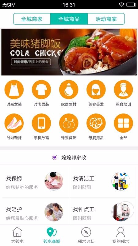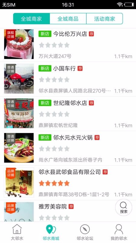 1、邻水商城,选择全城商家、全城商品或活动商家即可查看推荐的商家;