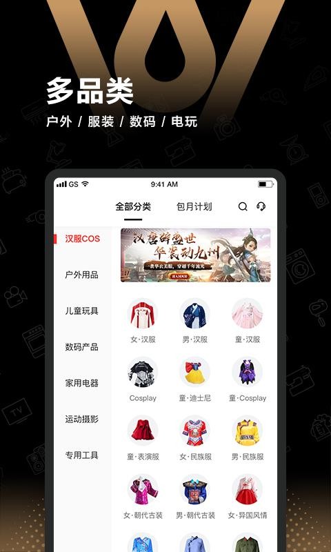 1、为用户提供汉服COS租赁功能,用户可以租赁到各种汉服和COS服装;