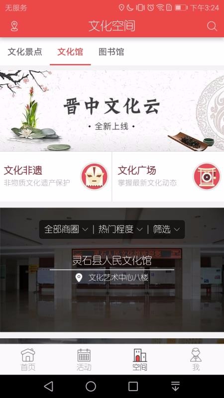 4、文化空间中又收集了不同类型的空间资源,展示文化景点、文化馆以及图书馆几个栏目;