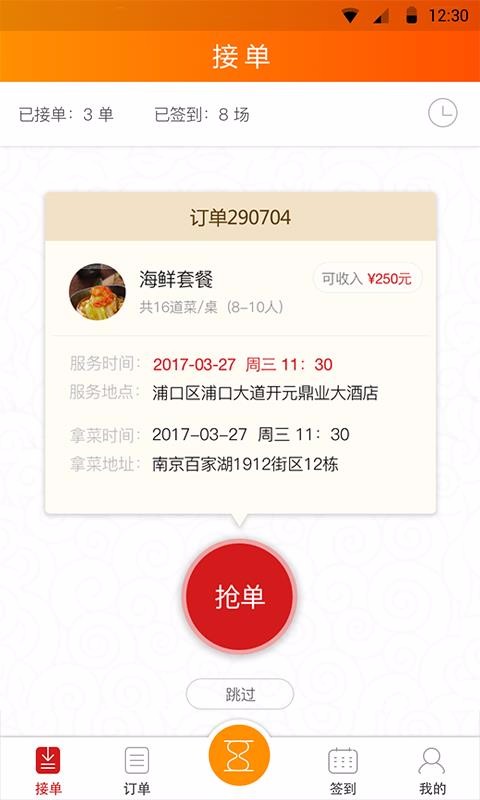 2、点击抢单图标即可抢接该单,选择点击跳过就能跳过进入下一个新订单页