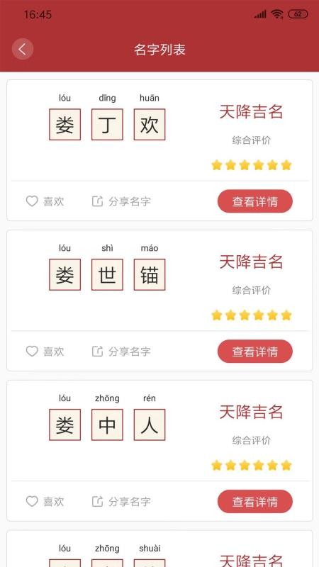 3、添加名字到自己的喜欢列表中,查看到心仪的名字时点击喜欢,方便对比查看;