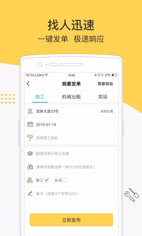 2、选择一种发单类型,发单编辑之前需要用户点击施工或货运等类型来编辑订单内容;