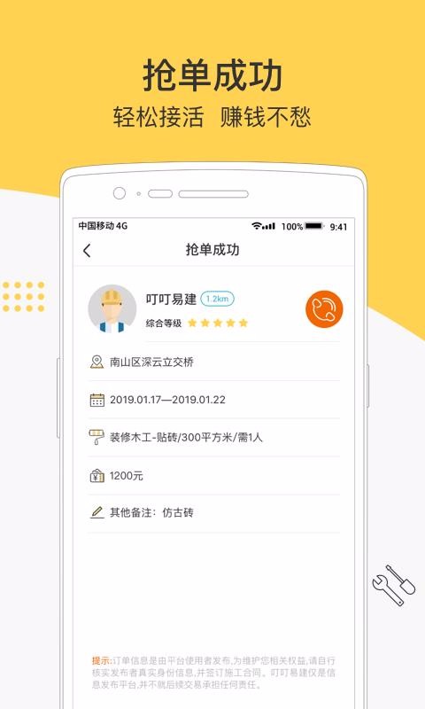 叮叮易建是为建筑工人们找活设计的软件,支持水电工、泥瓦工以及木工与油漆等不同的工人们在线听取不同的订单,找到自己能干的活并接单;应用中的工种项目涵盖了施工、机械出租、货运等不同的分类栏,可以根据自己的需要选择不同的标签听取对应的需求订单;作为普通的居民也可以使用这款软件,软件上设置了我要发单专区,可以在这里编辑自己需要的建筑或施工需要内容,然后将自己的需求订单发布到该平台上,让平台上的好友及时发现自己的订单并接单;平台为工人们打造了一个工友之家专区,在这里能找到一起干活的工友在线聊天或结识更多朋友。