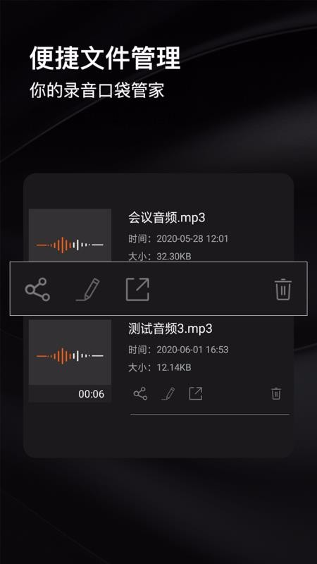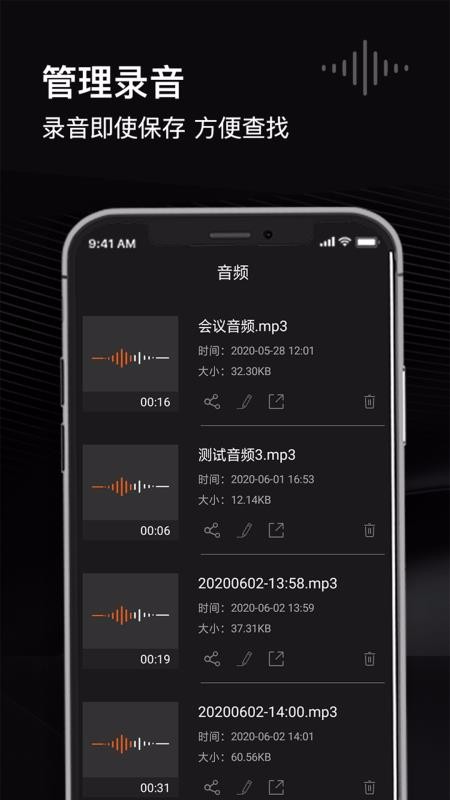 智能录音管家是一款便捷方便的录音软件,为用户记录生活中的美好;用户能将自己重要的事情录下来保存,防止忘记重要的事;家庭聊天的重要时刻随时录将家庭的美好都记录下来;各种课堂讲座录音,能在课后完善学习,提高对知识点的巩固;工作会议记录能让用户更好的保存主要的工作信息,避免工作数据的丢失;演讲和采访也能变得更轻松,录音文件能更好的被保存;后台录音能不打扰其他应用的运行,不占用手机的运行内存;还能对路易文件快速编辑管理,提高录音文件的使用率,让文件更方便查询。
