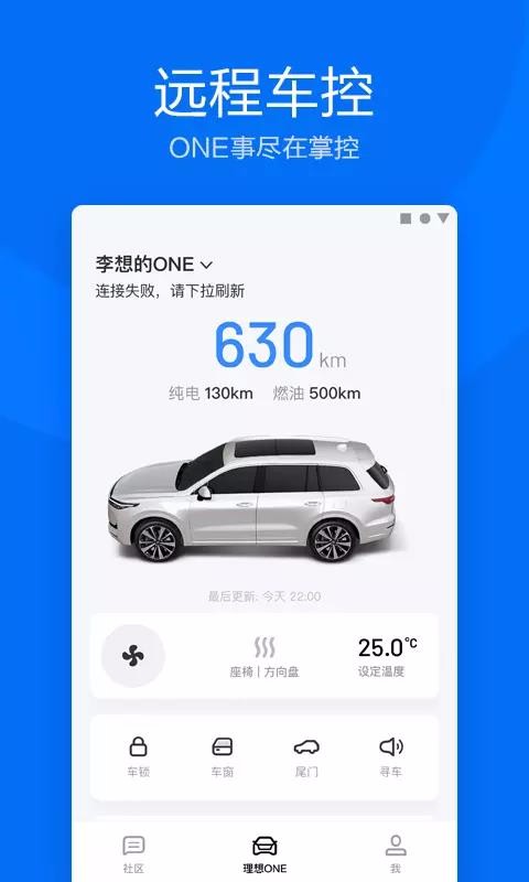 理想汽车是一款理想one汽车的全方位服务软件,为理想one的车主提高更便捷的汽车服务;理想one汽车的详细数据让用户在线查看,便于选择自己的理想汽车;预约试驾还能快速的体验实际的驾驶感觉,提高对汽车性能的了解;远程控车能快速了解汽车能运行的公里数,还能对汽车内空调的管理,让车主驾驶能得到更好的体验;一键锁车、关窗、关尾门都能快速的完成对汽车的控制,还有卫星定位让用户能快速的找到自己汽车的位置;在线预约汽车的保养能让4s店取车保养,减少车主保养的时间;更有社区为用户展示汽车的别样风采。