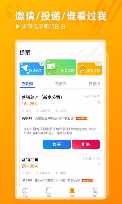 6、有多个不同的提醒专区,实时展示投递状态、职位邀请以及谁看过我的消息提醒标记;