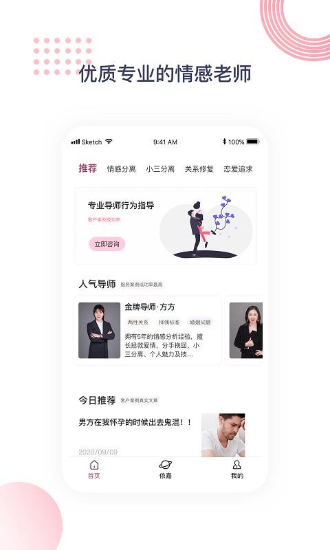 依嘉情感app是一款专业的情感咨询服务手机软件,能够为用户提供专业的情感咨询服务,你有任何情感问题都可以在这里进行咨询,能够及时的为您解答;这里有最权威的导师为大家解惑答疑,还有许多真实的情感案例可以免费学习,还可以根据用户的问题为您提供有效的解决方案,这里的内容非常的丰富,涵盖情感挽回、婚姻修复、小三分离、情商培训、恋爱指导、亲子关系修复等等内容,能够给您更好的指导方案,并且价格实惠,让你可以花费最少的费用解决最烦恼的问题,你也快来下载安装体验体验吧。