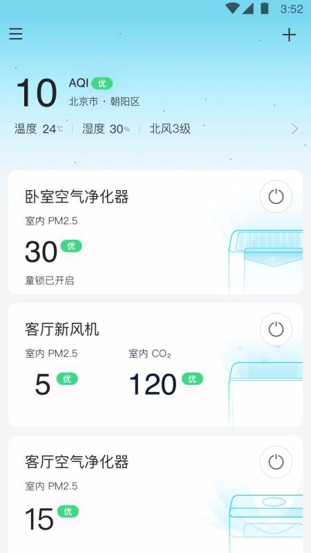 352Air是一款空气质量检测软件,帮助用户解决更多的空气污染问题;用户能连接家庭内的智能空气净化器,让用户能远程控制并使用,也能时刻关注家庭内的空气质量,所有的数据都实时查看,也会为用户记录空气质量的变化情况,让用户能知道净化器带来的空气进化效果;用户还能查看全国各地的空气质量数据,让用户关注全国的空气质量变化情况;各空气净化器能有效的完成对室内空气的净化效果,让用户在家能呼吸健康的空气,空气检测仪能检测室内的各项空气数据,让用户能准确的知道家庭内是否需要开启空气净化器。