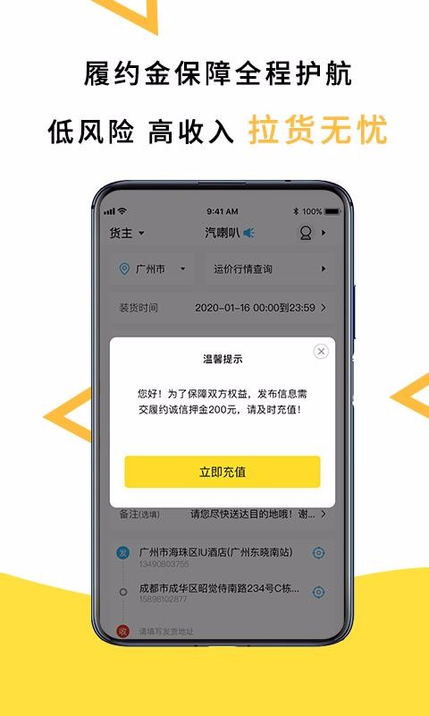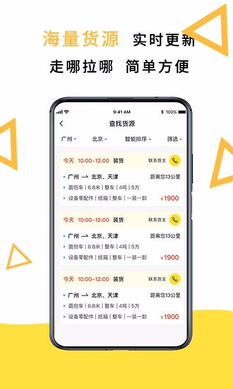 4、货源中心的订单展示丰富内容,上面都展示了用车需求、路线、货源内容以及价格等;
