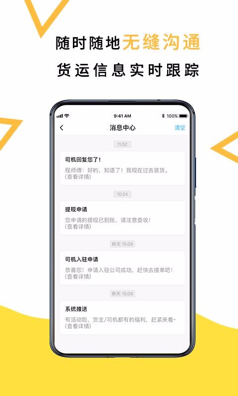 3、清晰的消息回复提醒,消息中心会展示申请状态提醒、司机回复提醒以及提现申请提醒等;