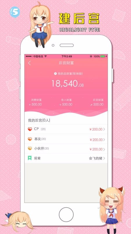 5、可以在该平台中创建后宫,收人和消费都可以获得财富;