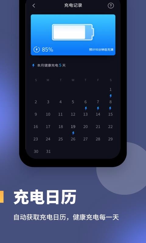5、拥有充电日历,自动记录你充电的日期,并统计健康充电的天数;