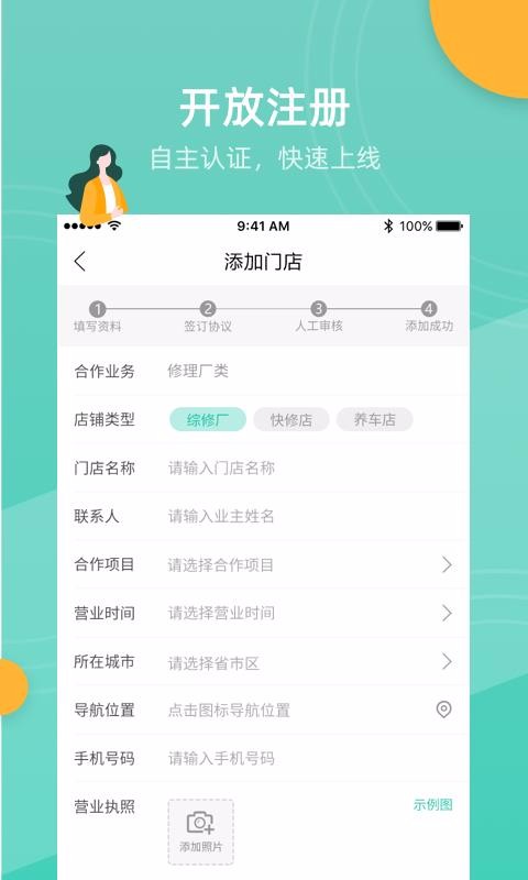 2、展示了清晰的添加门店审核流程,有填写资料、签订协议、人工审核以及添加成功环节;