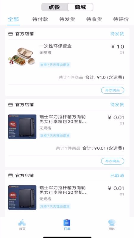 6、订单中划分不同订单,根据消费位置不同划分了点餐与商城订单,每个栏中还有不同状态划分;