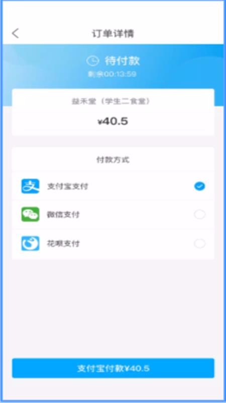 1、同时支持三种不同方式支付,在付款方式栏中设置了支付宝支付、微信支付与花呗支付三种方式;