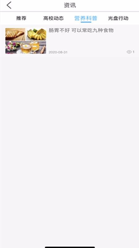 5、资讯中又分为不同内容栏,其中有推荐资讯栏,还有高校动态、营养科普以及光盘行动栏;