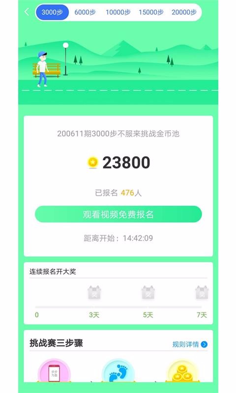 6、进入挑战活动页面,选择步数即可报名参与挑战