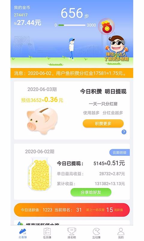 2、提供了各种赚钱玩法,有排名、互动、走路、挑战等赚钱方式;