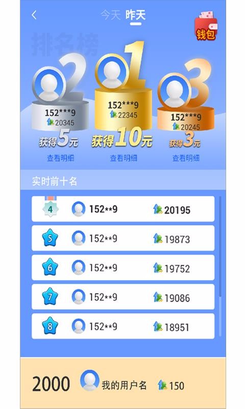 4、在首页中随时显示用户的排名、收益、兑换、提现等数据,并实时更新;