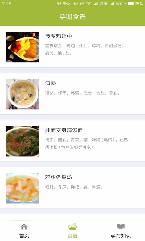 4、该应用页面简洁,功能分布也简单,包括食谱和孕育知识两部分;
