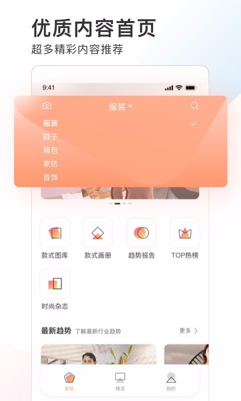 3、每个行业中都涉及了许多元素内容,其中有时尚杂志、TOP热榜、趋势报告等专区;