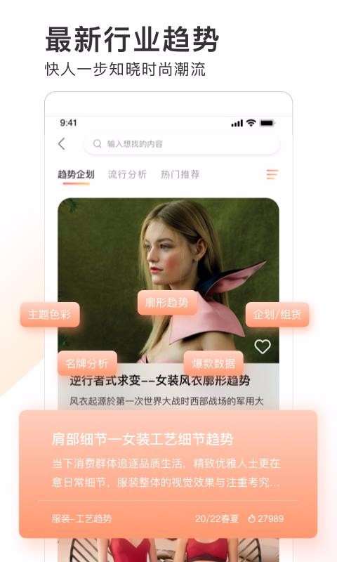 POP趋势是一款服务于时尚爱好者或设计师的资讯软件,整合了服装、鞋子、家纺以及首饰等五个不同时尚领域最新的资讯资源;发现不同行业领域中的款式图库、款式画册以及趋势报告等,可以在每一个不同的专区中获取自己的灵感设计素材,也可以在最新趋势消息栏中掌握到该行业目前的趋势情况;在每一个行业领域中都设置了对应的时尚杂志专区,从里面能看到最新期刊的杂志内容,从电子杂志中的各种时尚大图中能感受当下流行的元素;每一个行业都有自己比较知名的品牌,能在热门品牌栏中关注自己比较喜欢的品牌并随时接收该品牌的趋势动向。