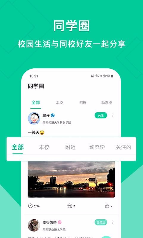 2、能看到其他学校好友的动态,同学们能在同学圈中查看除本校以外好友动态;