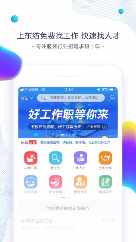 东纺招聘app是专注于招聘服装人才的多功能软件;求职者可以使用这款软件查看到众多的招聘信息,可以根据自己的需要及时的进行咨询,能够提高求职者的求职成功机会;企业可以使用这款软件进行实时的寻找人才,能够及时的发现众多的人才,为自己的企业招纳到更多优秀的服装人才;求职者使用这款应用在线编辑自己的简历,能够及时的将简历投递给自己的心仪的企业,企业也能够及时的查看到人才的简历,能够有效的促成招聘双方的需求,将招聘求职顺畅高效的完成,更加便捷进行。