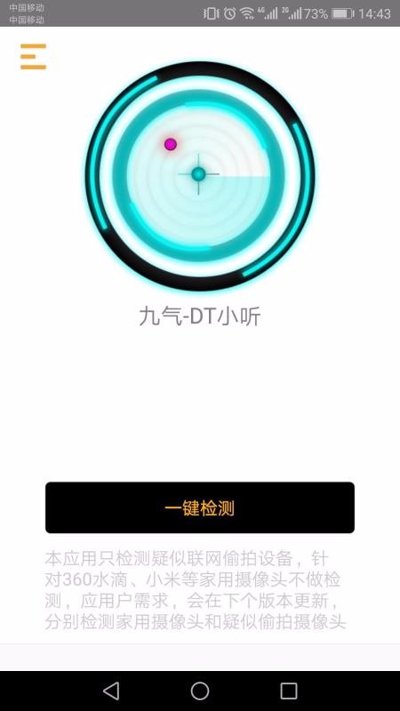九气DT小听app是一款功能强大的摄像头扫描软件,由安徽谛听信息科技有限公司研发的,它具有快速、精确、易用等特点,它可以一键扫描联网针孔摄像头,有了它的帮助下,无论你是在洗澡间还是宾馆,再也不用担心自己的隐私会被暴露了,它可以保护您和您家人的安全,在使用上非常简单,确认手机连接到wiif后,点击一键检测。等待1-2分钟,就可以使用了,经常需要外出的用户可以下载试试看。